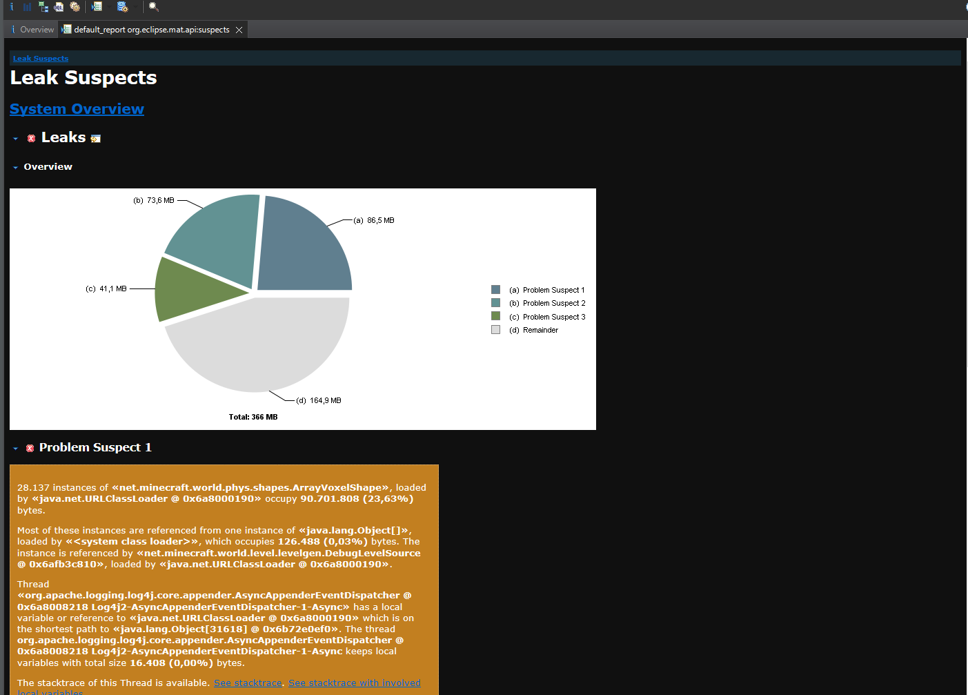 After some processing it'll provide us with a list of suspected leaks. They will be shown in order of heap usage by their corresponding class name. The class name is key to finding out what's using up all your memory. Besides checking for anything that might be familiar within said names, we can also Google the class name to try and find a GitHub repository. MAT will always show leak suspects, so a healthy server can also produce a "Leak Suspects Report" which is actually completely normal.